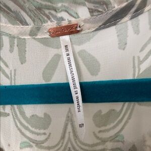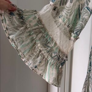 Chic long sleeve dress with a flowing silhouette. Features a subtle green and cream pattern. Ideal for casual outings.