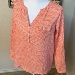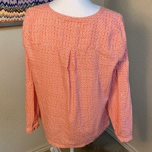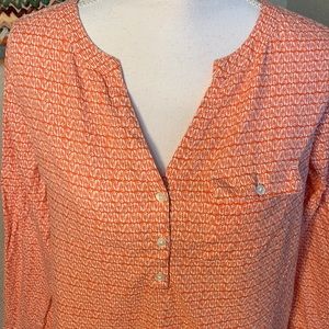 J. Jill women’s size small top. Soft orange and white print. 100% cotton (very soft). Placket front. Convertible sleeves. Bust measure 42”. Length is 23”. Excellent condition. 621/26