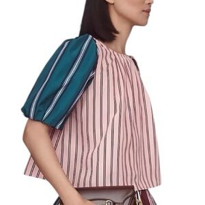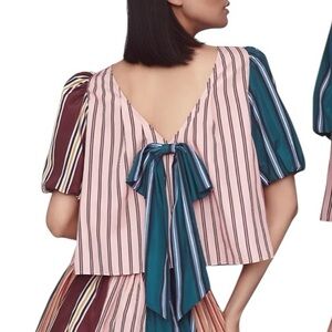 Maeve Anthropologie Taffeta Bow Swing Blouse Puff Sleeve size XS Pink Stripe