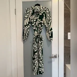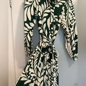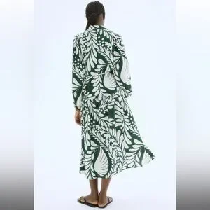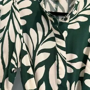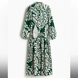 H&M Green and White Leaf Print Long Sleeve Dress Puff-Sleeve