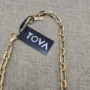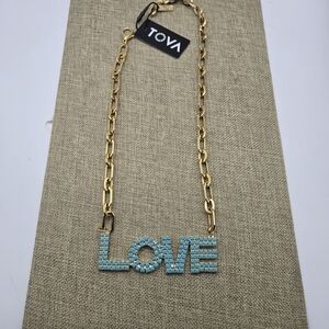 Stylish gold TOVA necklace featuring a distinctive Love pendant. Ideal for enhancing any ensemble with elegance. 22 inches in length.