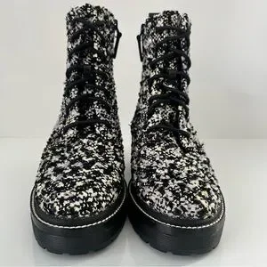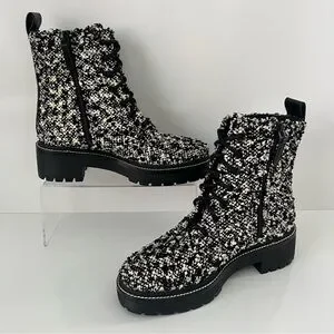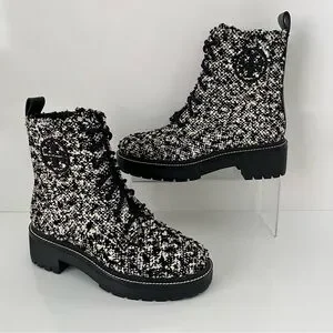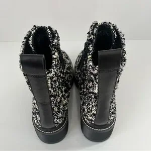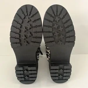 Capture the attention of fashionistas with these spectacular and stylish Tory Burch Miller Lug Sole Combat Booties. This exquisite pair is crafted with a luxurious tweed textile and leather accents in the sophisticated color combination of Perfect Black/New Ivory. They feature a trendy lug sole and tonal hardware, blending classic texture with a modern, edgy design. The Tory Burch logo accent and convenient inner side zipper offer both authentic designer luxury and ease of wear. These boots are a must-have centerpiece for anyone looking to elevate their fall and winter wardrobe.