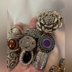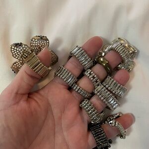 Discover this exquisite set of women's rings featuring elegant silver and gold tones. Perfect for adding a touch of sophistication to any outfit. Some in this lot are vintage and some are newer. All have the stretchy back for size adjustments.