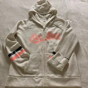 Cozy tan hoodie with pink Old Navy logo. Perfect for casual wear.