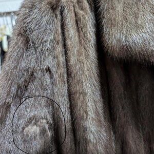 Luxurious grayish brown fur coat perfect for adding a touch of elegance to any outfit. Stay warm and stylish with this timeless piece. Coat has been repaired on the right arm.