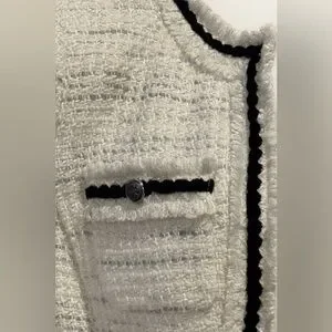 Polished WHBM CHANEL-like tweed blazer with subtle silver shimmer and black trim for a refined, Chanel-inspired look. An easy piece for work, dinners, or elevated casual styling.