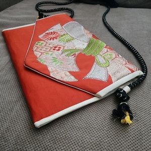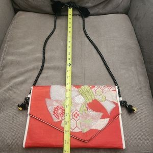 This one-of-a-kind handmade clutch bag is crafted from authentic, repurposed vintage Japanese obi silk fabric. The rich red base is adorned with traditional, ornate brocade and embroidered patterns in shades of white, lime green, and gold, likely depicting auspicious motifs such as fans or floral arrangements, making it a true statement piece of ethnic evening wear.