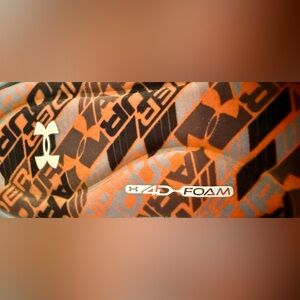 These Under Armour slide sandals feature a bold orange and grey design with the brand's logo prominently displayed. They are designed for comfort with a cushioned footbed.