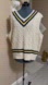Cream cable knit vest featuring blue and yellow stripes. Perfect for layering. Stylish and versatile.