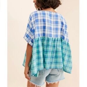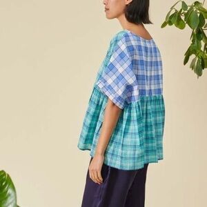 -Boxy, cropped shirt with gathers at the shoulders and swingy trapeze shape