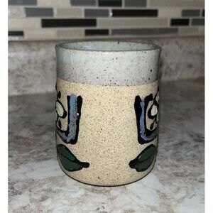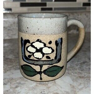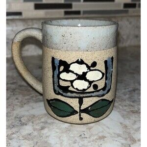 This vintage coffee mug features a beautiful floral pattern on both sides. The stoneware material and retro style give it a unique charm, perfect for hot or cold beverages. The handle and decorated design make it a great addition to any kitchen or collection. The mug is medium sized and comes with a set that includes a coffee cup. It's a perfect gift for anyone who loves flowers or vintage items.