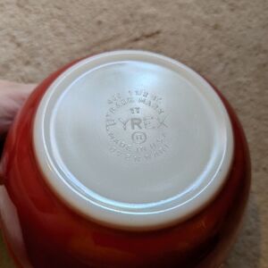 Set of red and green Pyrex mixing bowls. Size 402 (red) and 403 (green).