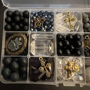 Creepy & eerie beads for making bracelets, earrings and necklaces. Beads are new and recycled. Necklace and case (7” x 4”) included. Maximum 5 cases to a bundle for weight restrictions. Ghostly photo not for sale.