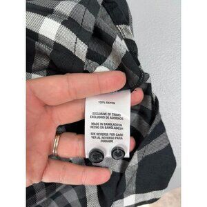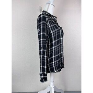 Woolrich brand women's size small black and white plaid button front shirt. In great pre-owned condition. Lightweight material with long roll tab sleeves and a collar. Slightly longer in back than front.