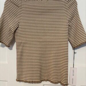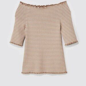 This elegant off-the-shoulder sweater features a ribbed knit texture in a chic tan and cream palette. The three-quarter length sleeves and form-fitting silhouette offer a flattering fit, while the cropped design adds a modern touch.
