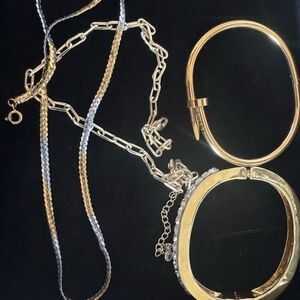 This exquisite jewelry set features a stunning combination of gold and silver tones, perfect for any occasion. The elegant design adds a touch of sophistication to your ensemble. One of the bracelets is missing a crystal hence the price!