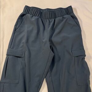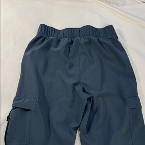 Bluish, gray cargo jogger pants. Excellent condition, worn only once or twice. Features elastic waistband. Cargo pockets have zippers.