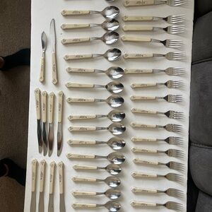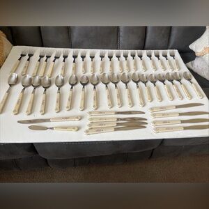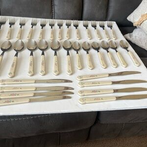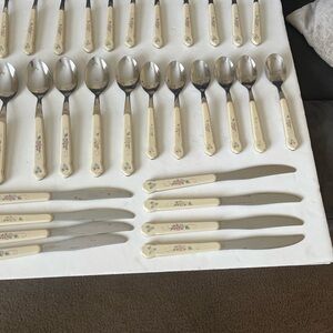Elegant cutlery set featuring floral designs on cream handles. Includes knives, forks, and spoons.