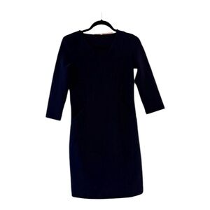 Sophisticated navy dress with V-neck and pockets. Long sleeves and flattering silhouette. Perfect for any occasion.
