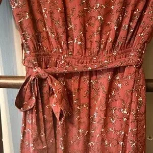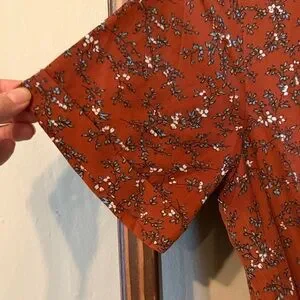 Charming terracotta faux wrap dress with floral pattern. Features short sleeves and a waist tie. Ideal for casual outings. Maternity friendly. Comes from a smoke and pet free home.