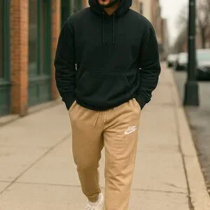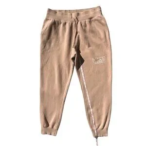 Soft Nike fleece joggers in a tan neutral tone with an embroidered swoosh logo, drawstring waist, and ribbed cuffs. Comfortable, relaxed fit perfect for everyday wear, lounging, or athleisure outfits.