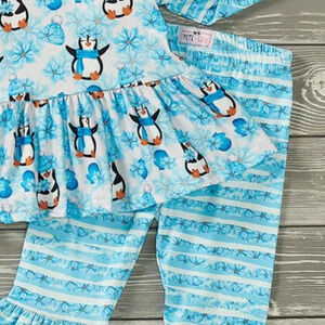 PETE + LUCY Playful Penguins Winter Ruffle 2 Piece Pant Set Floral Girl 5 NEW