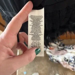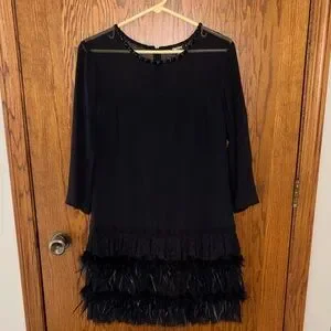 Chic DKNY dress with long sleeves. Features elegant feather detailing. Perfect for special occasions.