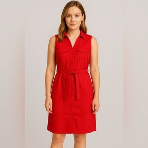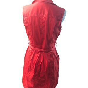 New York & Company sleeveless red dress, size 6. Features a belt, front zipper, and front pockets. Made of 97% cotton and 3% spandex with stretch. In excellent condition with no issues. 78