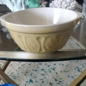 Beautiful yellow ceramic mixing bowl with intricate patterns. Perfect for kitchen use or display.
