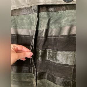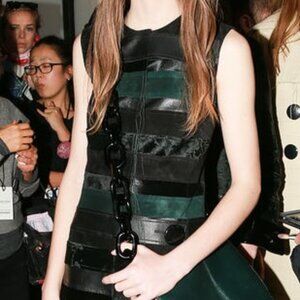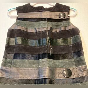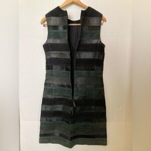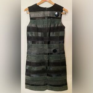 Calvin Klein Size 4 Fall/Winter 2015 Leather Panel Mini Dress in neutral black/gray/green panel pattern with large button details. Good used condition with normal wear. Please note that the dress paneling in the chest area has a deconstructed look design with the appearance of loose threads as shown in backstage fashion show photo. Based on personal preference, the buyer may want to alter the appearance and tack up the loose-looking threads.