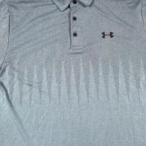 Elevate your game with this Under Armour men's polo shirt. Experience ultimate comfort and unrestricted movement thanks to its innovative design and breathable fabric. The stylish teal hue, accented with a subtle geometric pattern that transitions from the chest down, adds a modern touch to your athletic wear. The classic polo collar and button placket provide a timeless look, while the performance-oriented construction ensures you stay cool and dry, whether you're on the golf course, at the gym, or enjoying a casual day out.