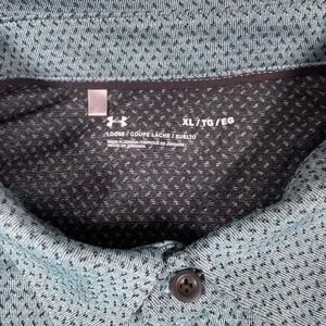 Keywords: Under Armour polo, men's athletic shirt, golf shirt, performance wear, breathable fabric, activewear, casual top, sportswear, loose fit polo, teal polo, geometric pattern, quick dry, athletic fit