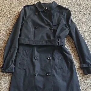 Elegant black trench coat with double-breasted design. Features a matching belt and buttoned cuffs. Removable lining that is reversible for the classic Burberry pattern or solid black.