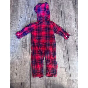OshKosh Baby Boy Plaid Hooded Romper 12M Red Blue One Piece Outfit