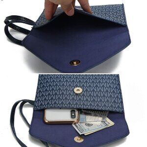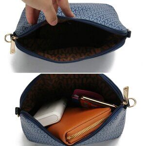 Features: This trendy 3-piece set includes a spacious top handle tote, a versatile pouch that can be worn as a crossbody or pouch, and a sleek wristlet for your essentials. Gold-tone details and a signature charm add a luxe touch. The tote has a roomy center pocket, zippered wall pocket, and exterior back pocket—super functional! The vegan leather feels soft yet durable, with a smooth fabric lining inside.