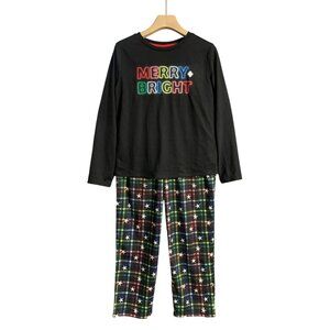 This kids' pajama set combines comfort and style, featuring a festive "Merry Bright" top and plaid star-print bottoms. Ideal for cozy nights or holiday mornings, this set offers a soft, breathable fabric for all-night comfort. It's a charming addition to any child's sleepwear collection.