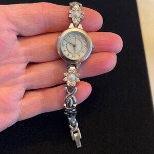 NEW Battery! Vintage Silver tone Bracelet Watch with Mother of Pearl Dial. Band has X's and two pearls on each side of the dial accented by small crystals. Very Pretty. Jewelry Clasp. Up to 7" wrist (my wrist is 6" and it is loose on me). Smoke free home. Offers Welcome!