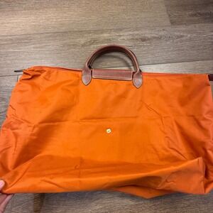 Keywords: Longchamp, Le Pliage, duffel bag, weekender, travel bag, orange, nylon, leather accents, oversized, carry on, gym bag, stylish, durable, spacious