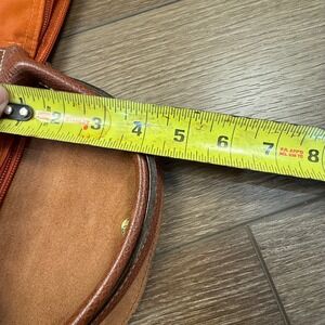 Burnt orange color with brown leather accents, zip closure with logo pull, fold over leather snap, two short leather handles (no long strap included), white interior