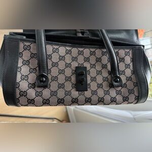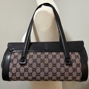 Crafted in signature GG monogram canvas with smooth black leather trim, this vintage beauty features Gucci’s hallmark bamboo accent across the top, a matte black push-lock closure, and dual rolled handles.