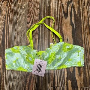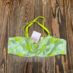 Neon green lace bralette with delicate floral patterns. Features adjustable straps for a perfect fit.