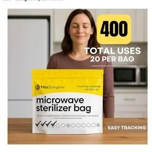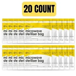 MaxStrength Pro microwave sterilizer bags in white and yellow. Convenient for quick sterilization. Brand new, never used. 20bags. 20 uses per bag.