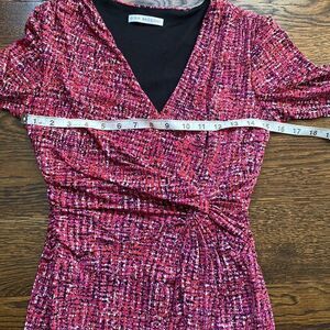 Beautiful faux wrap design dress by Gina Bacconi in purple, red, orange, and black.
