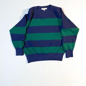 Madewell Hayes stripe merino wool sweater. Size Small. Navy and green striped crewneck with relaxed fit and ribbed trim. 100 percent merino wool. Preloved, excellent condition.