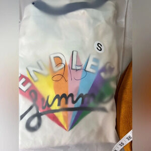 This fun graphic endless summer tee shirt. It is apart of the Ban.do endless summer line. It has the multicolored graphic in the front and the back. It has a 70s look and would pair great with a pair of chuck taylors!