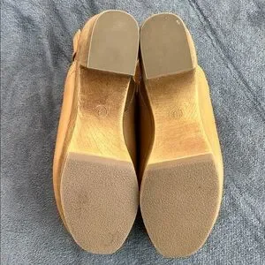 Chic tan mules with adjustable strap. Perfect for everyday style.