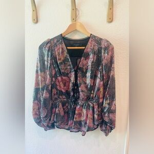 Ted Baker Juudie Black/Purple Floral Sequin Bishop Sleeve Tie Front Top Size 0