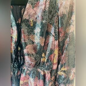 Description: Lightweight blouse features allover floral print embellished with sequins, tie closures at the front, v-neck, and three-quarter length bishop sleeves.