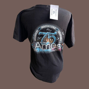 For fans of science, space history, and iconic NASA graphics—this Hanes tee commemorates 75 years of the Ames Research Center with dual-sided logos and stellar energy. Black cotton-blend tee with classic crewneck, short sleeves, and a soft, broken-in feel. Ideal for collectors, science nerds, and anyone who dreams in zero gravity.