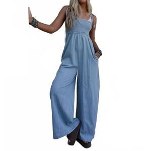 Introducing the Light Washed Smocked Cotton Jumpsuit by Three Bird Nest, a perfect addition to your summer wardrobe. Designed with tie tank top straps, this relaxed fit piece offers a flattering babydoll silhouette and flowy wide legs with convenient side pockets. Crafted from 100% Cotton, this imported jumpsuit features a smocked elastic bodice and charming ruffle details, capturing a boho style. Care: Hand wash cold and lay flat to dry for lasting wear. Measurements for size small: 20" bust, 20" waist, 44" hip, 50" length, and 29" inseam.